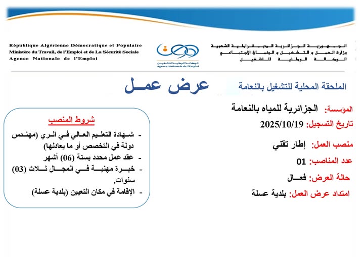 - عرض عمل في المؤسسة العمومية الجزائرية للمياه النعامة