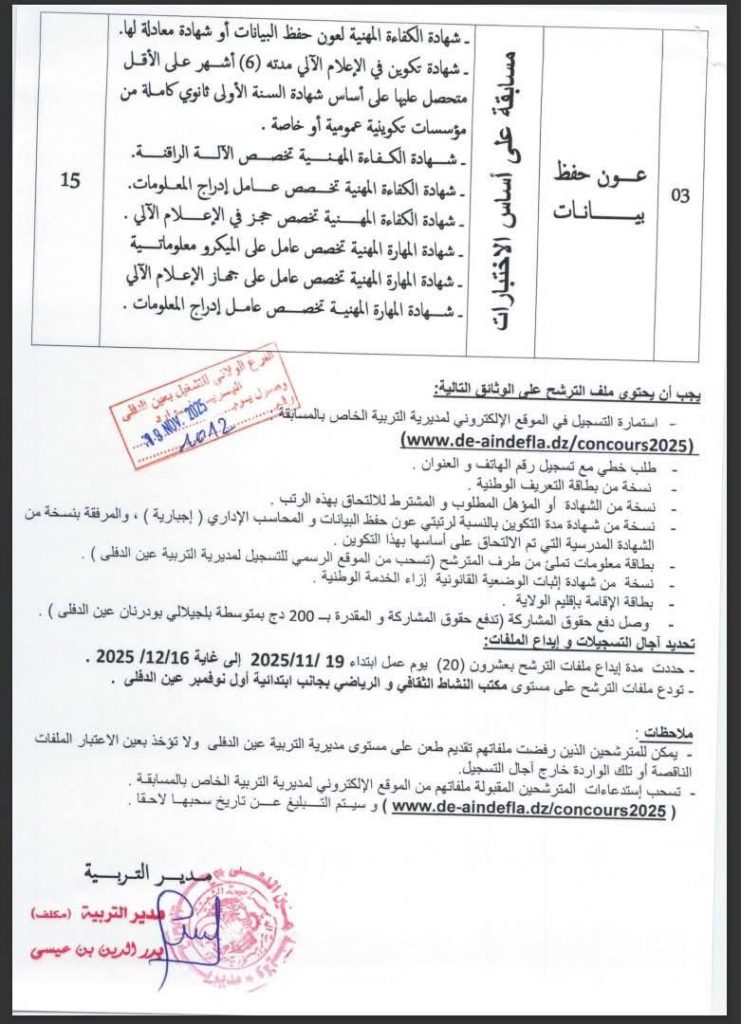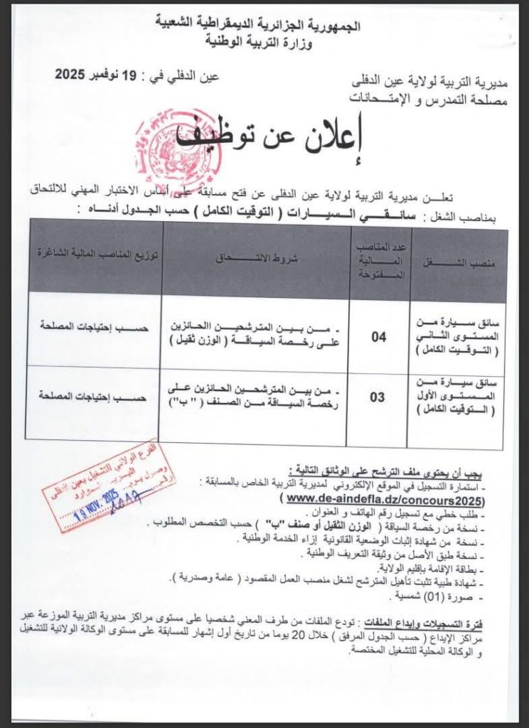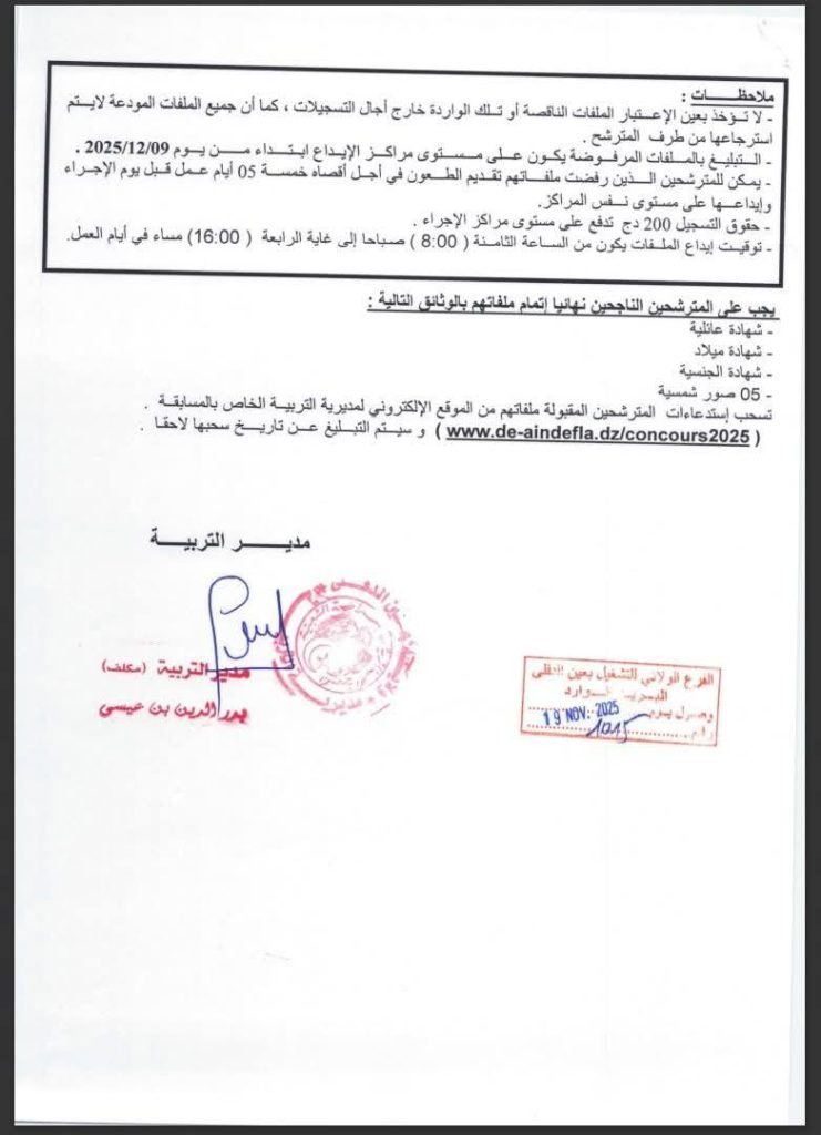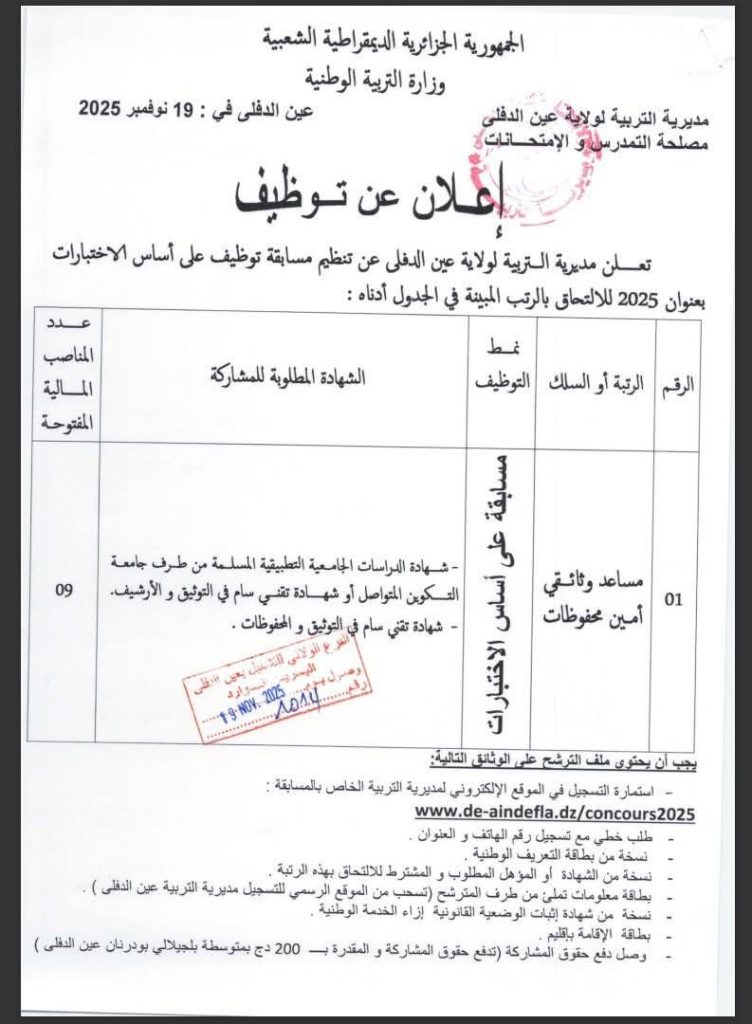 تعلن مديرية التربية لولاية عين الدفلى عن فتح مسابقة على أساس الشهادة للإلتحاق بمختلف الرتب وفق الصور التالية: