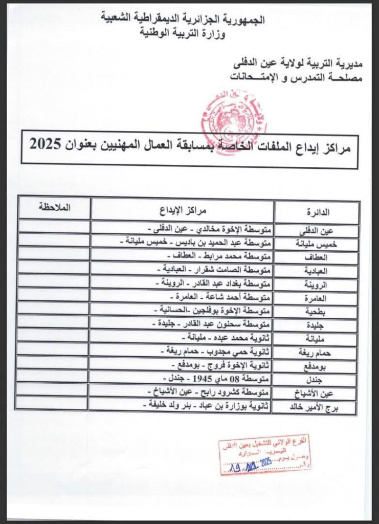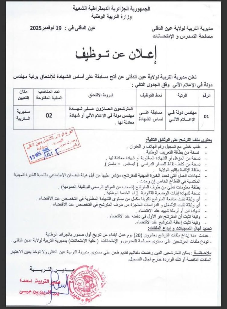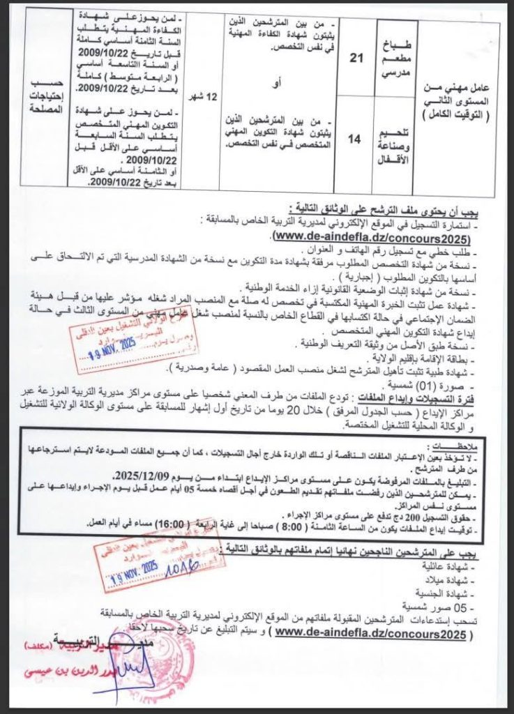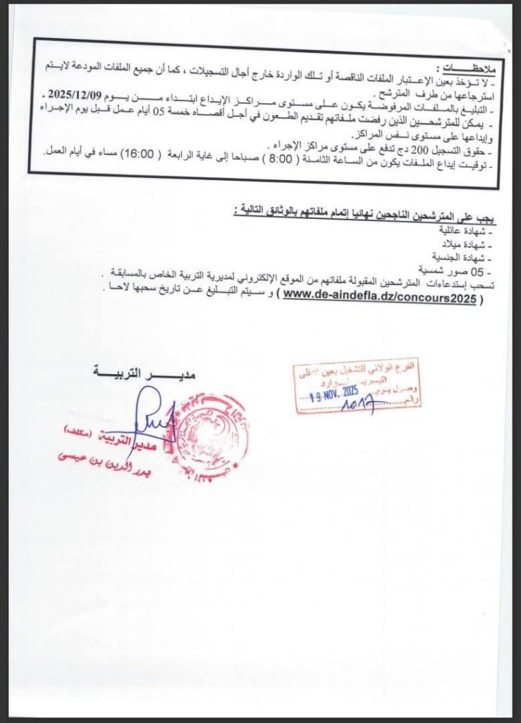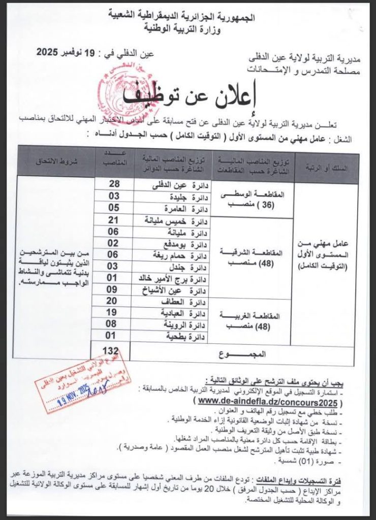 تعلن مديرية التربية لولاية عين الدفلى عن فتح مسابقة على أساس الشهادة للإلتحاق بمختلف الرتب وفق الصور التالية: