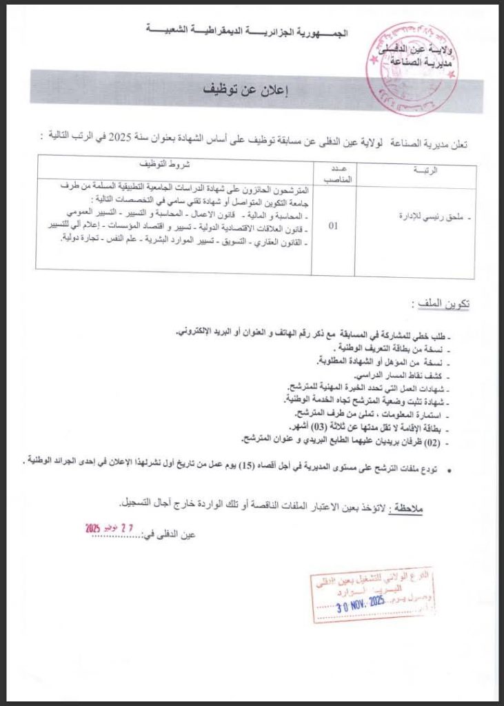 تعلن مديرية الصناعة لولاية عين الدفلى عن مسابقة توظيف على أساس الشهادة بعنوان سنة 2025 في الرتب التالية:
