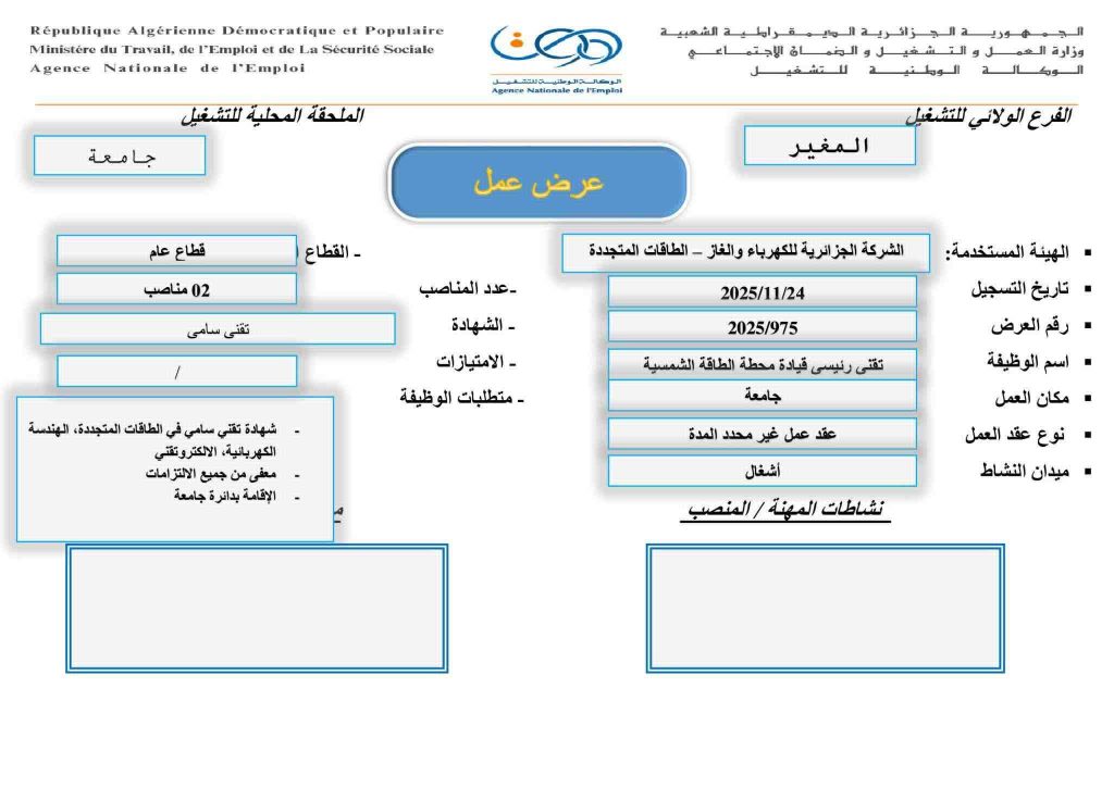 الهيئة المستخدمة: الشركة الجزائرية للكهرباء والغاز – الطاقات المتجددة